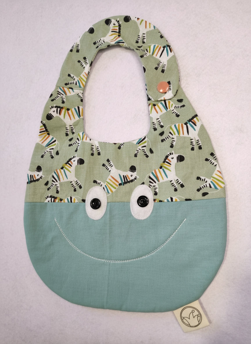 Questo bavaglino “sorridente” è cucito a mano con cura ed è perfetto per rendere i pasti (anche i più pasticciati!) un momento più allegro.