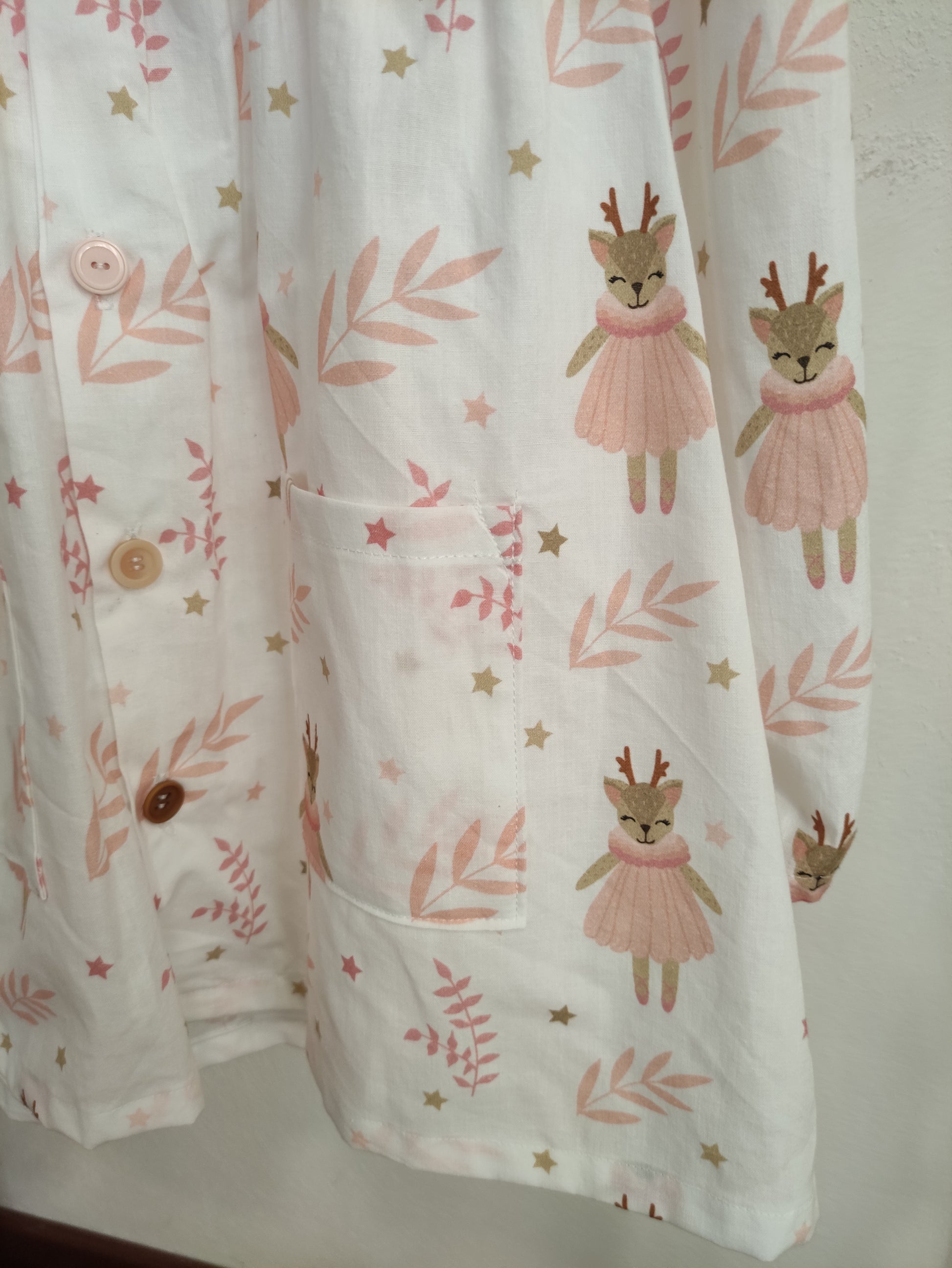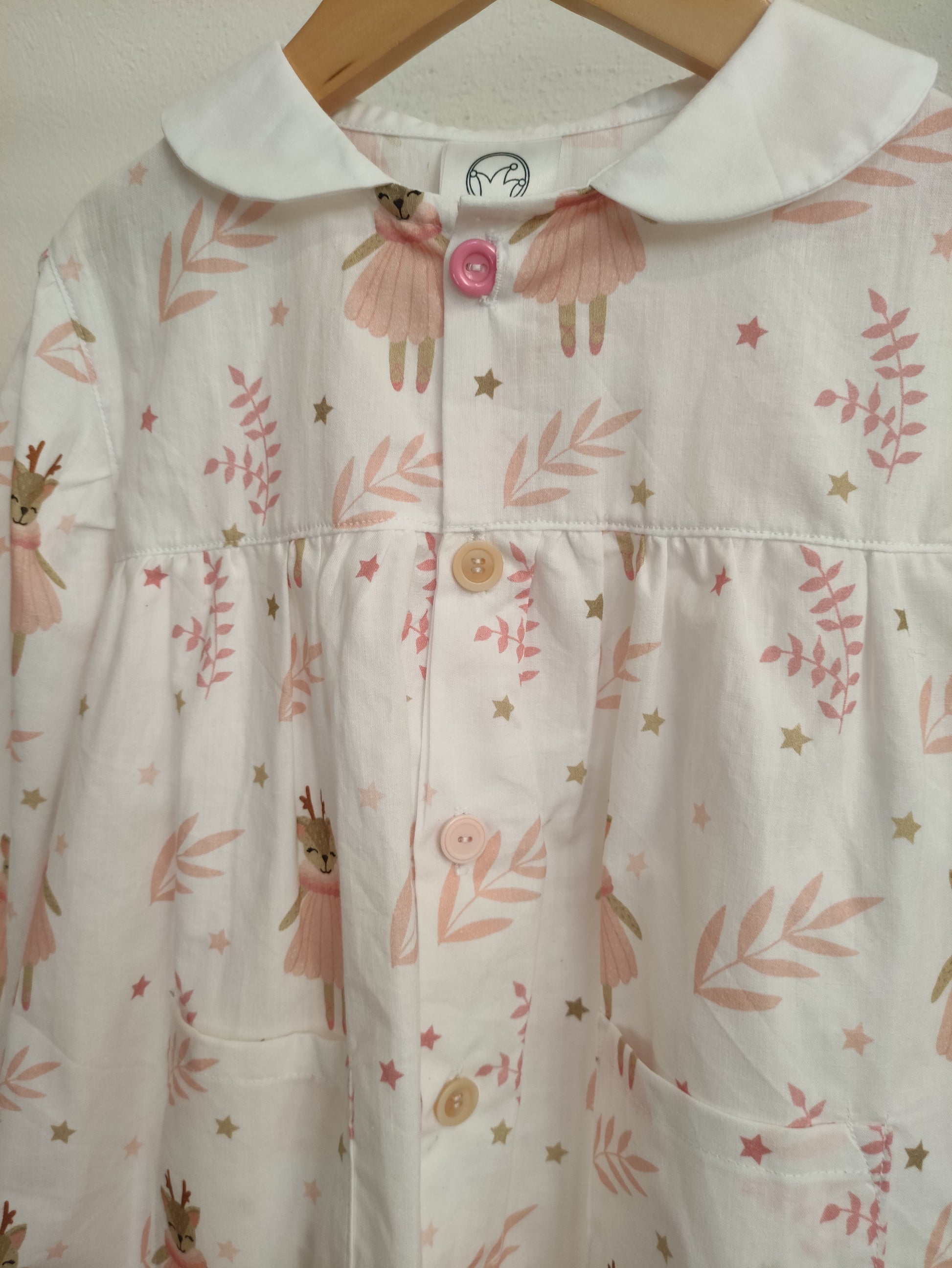 La chiusura frontale con bottoni colorati rende il grembiule allegro e facile da indossare, mentre le ampie tasche sono perfette per custodire fazzoletti, matitine o piccoli tesori raccolti durante la giornata.