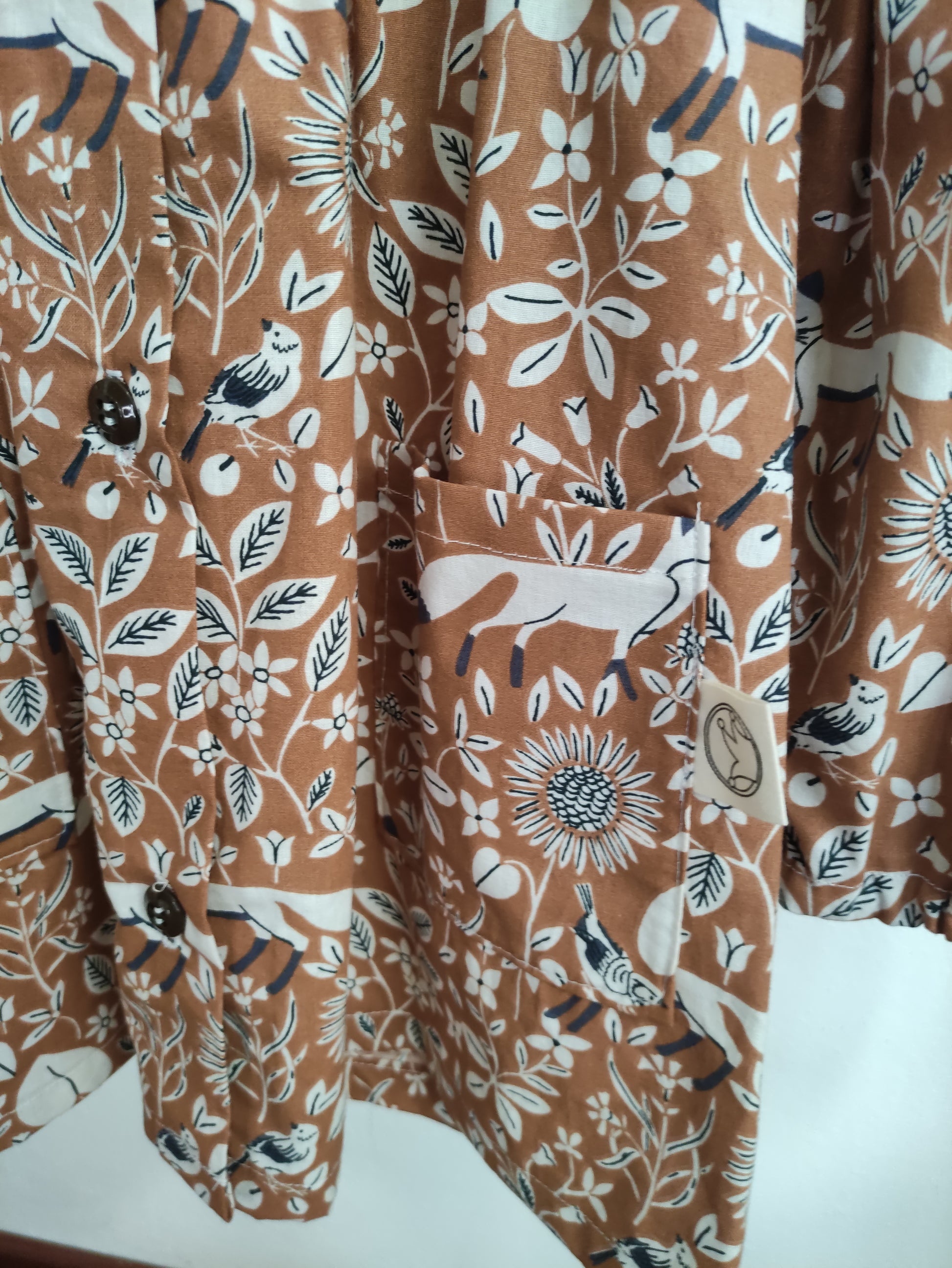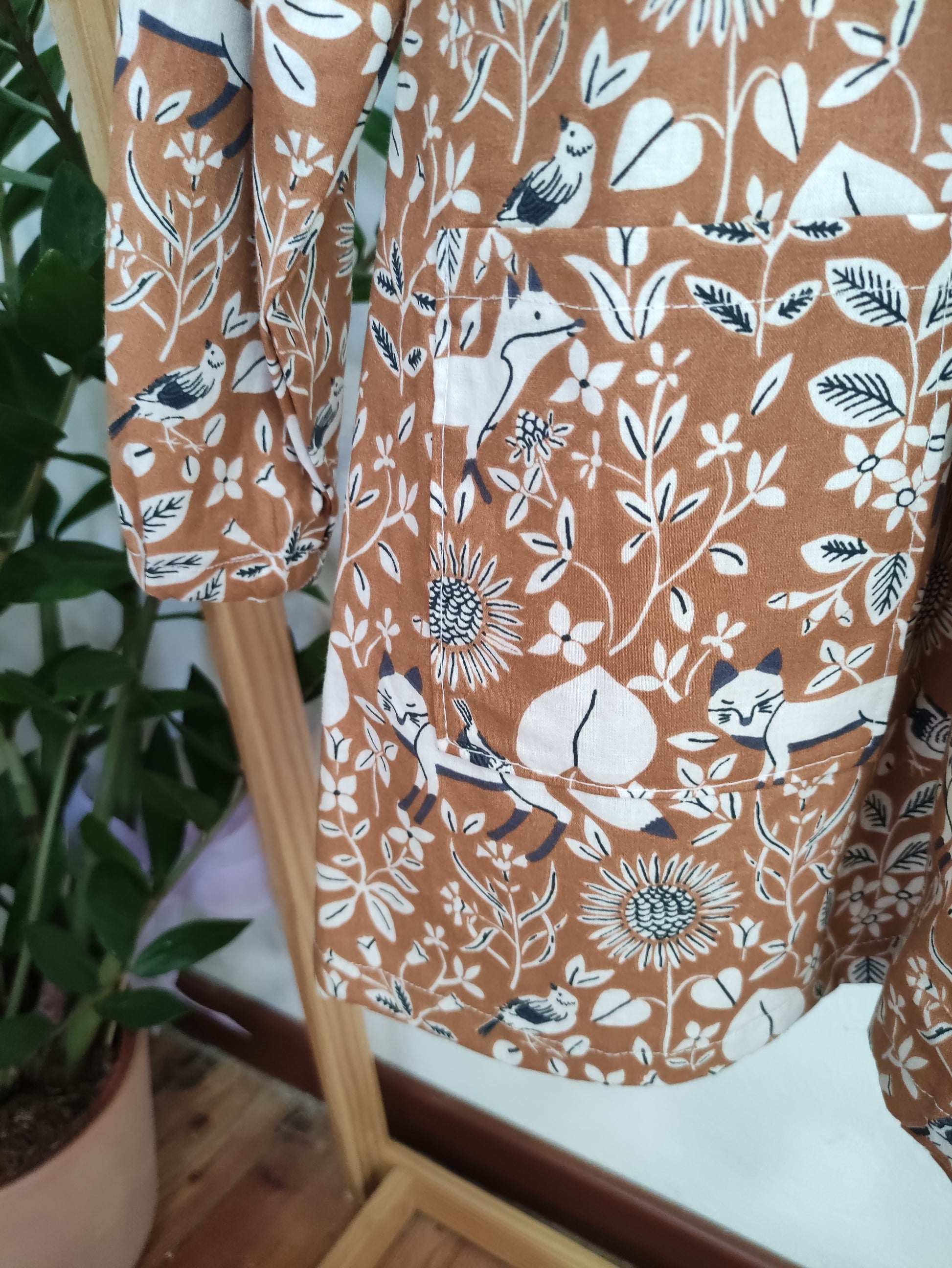 La chiusura frontale con bottoni colorati rende il grembiule allegro e facile da indossare, mentre le ampie tasche sono perfette per custodire fazzoletti, matitine o piccoli tesori raccolti durante la giornata.