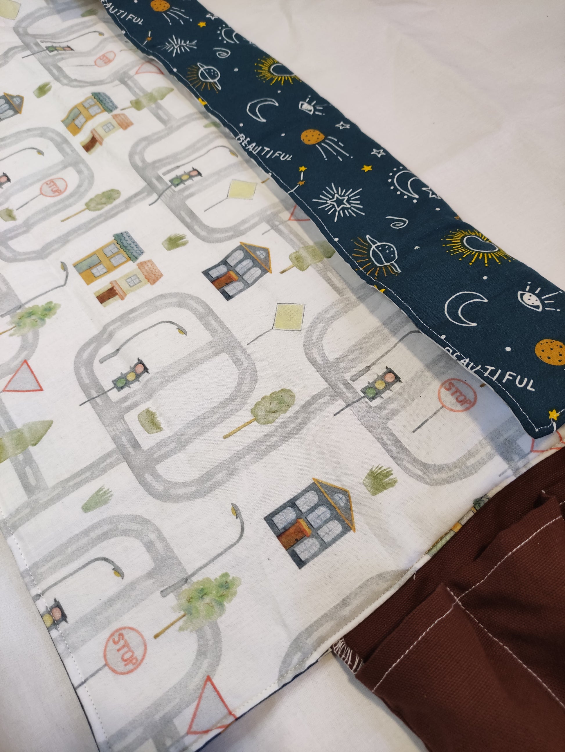 La mia pista per macchinine portatile è cucita a mano in 100% cotone e leggermente imbottita per essere morbida, pratica e super resistente alle avventure dei più piccoli.