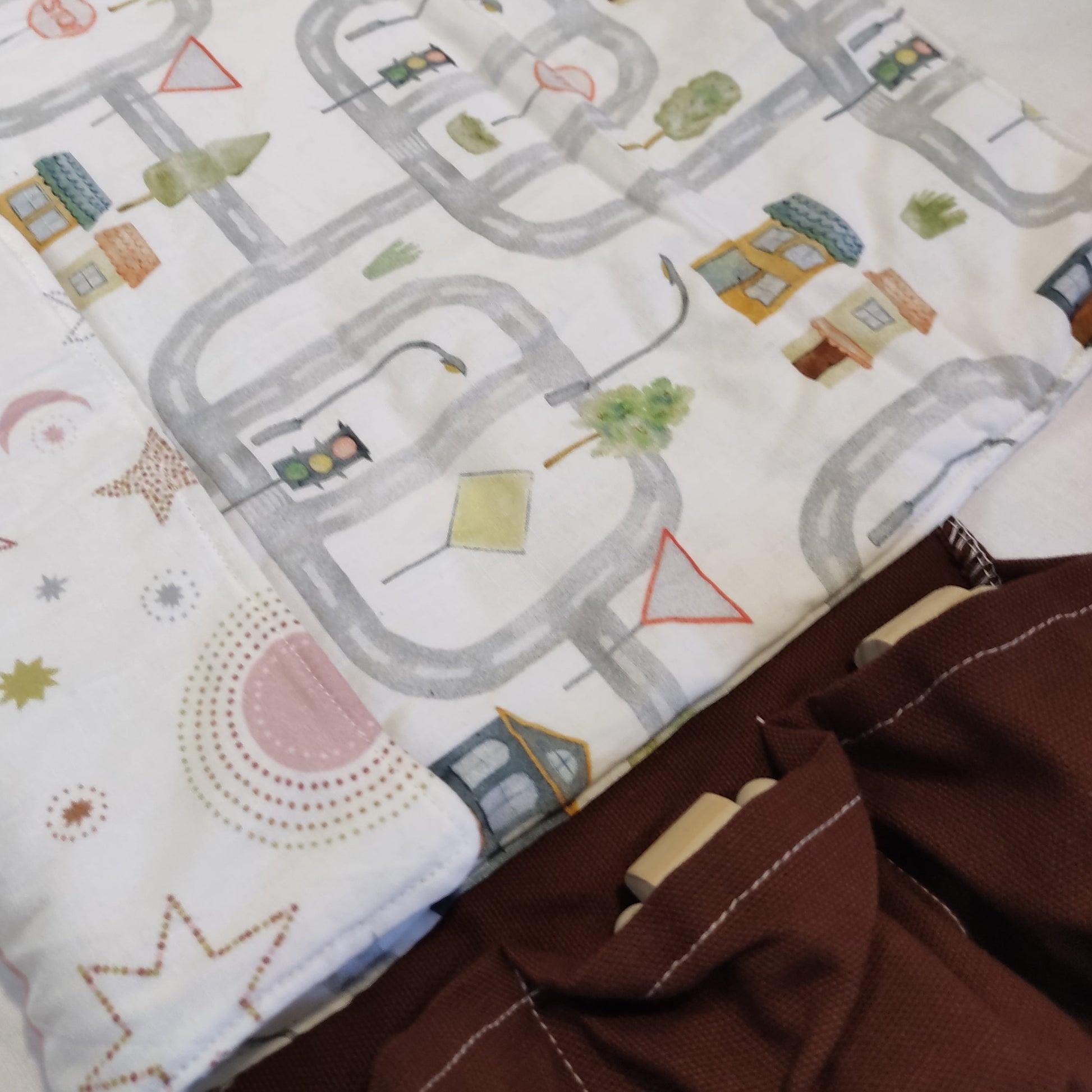 La mia pista per macchinine portatile è cucita a mano in 100% cotone e leggermente imbottita per essere morbida, pratica e super resistente alle avventure dei più piccoli.
