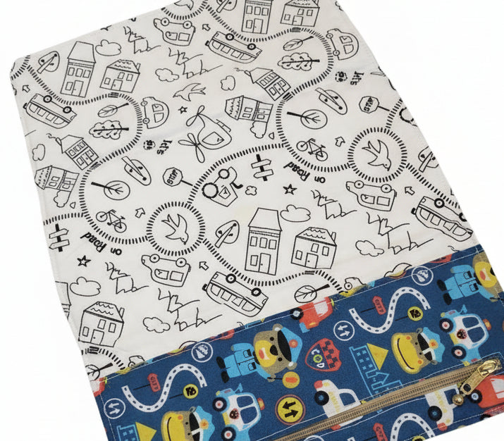 La parte frontale è realizzata in cotone stampato da colorare , così i bimbi possono sbizzarrirsi e poi… ricominciare da capo! Basta usare i pennarelli lavabili per bambini , mettere tutto in lavatrice e la tovaglietta torna come nuova, pronta per mille nuove avventure colorate.