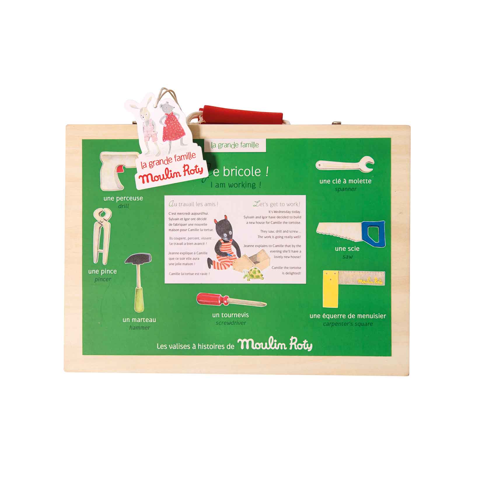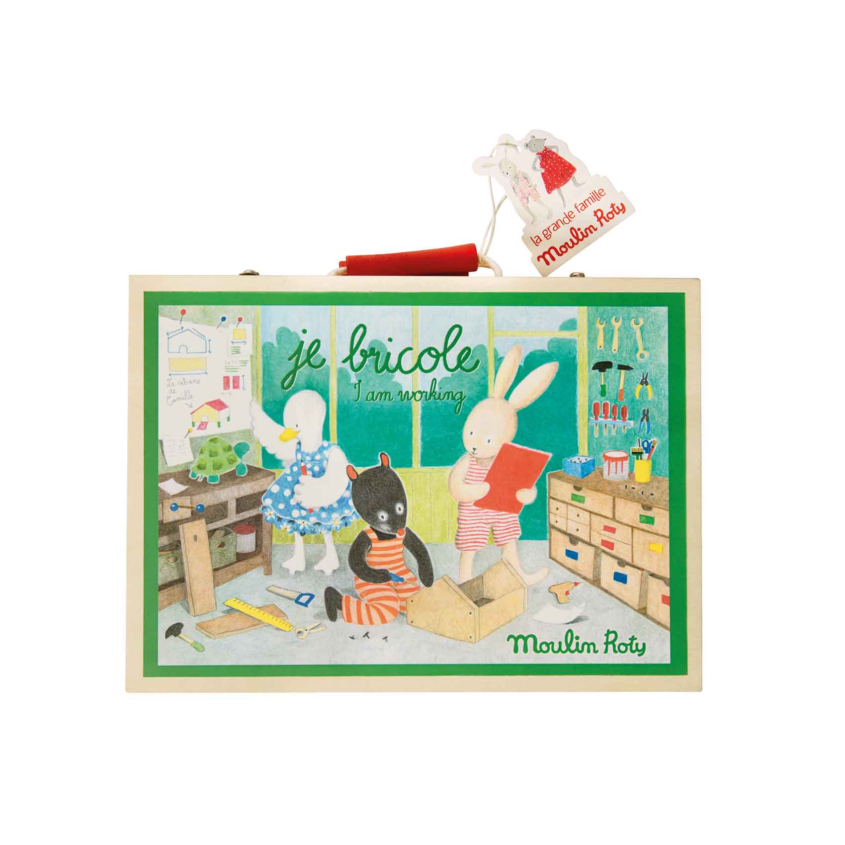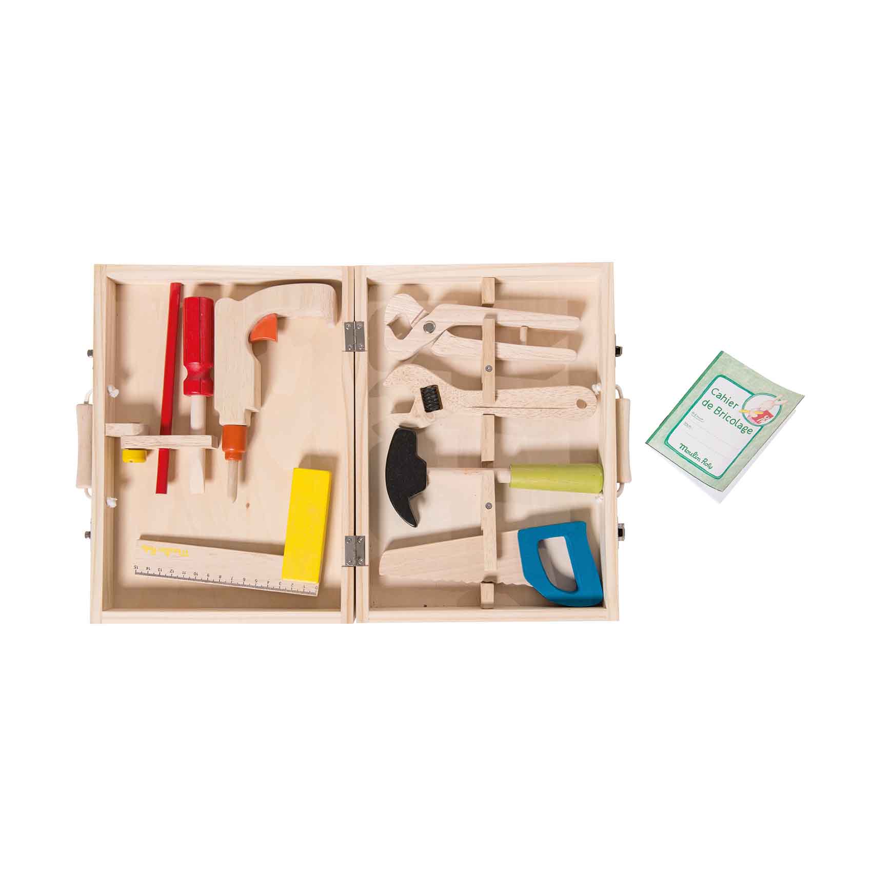 Valigetta in cartone richiudibile che contiene tutti gli attrezzi in legno di cui ha bisogno un vero falegname.