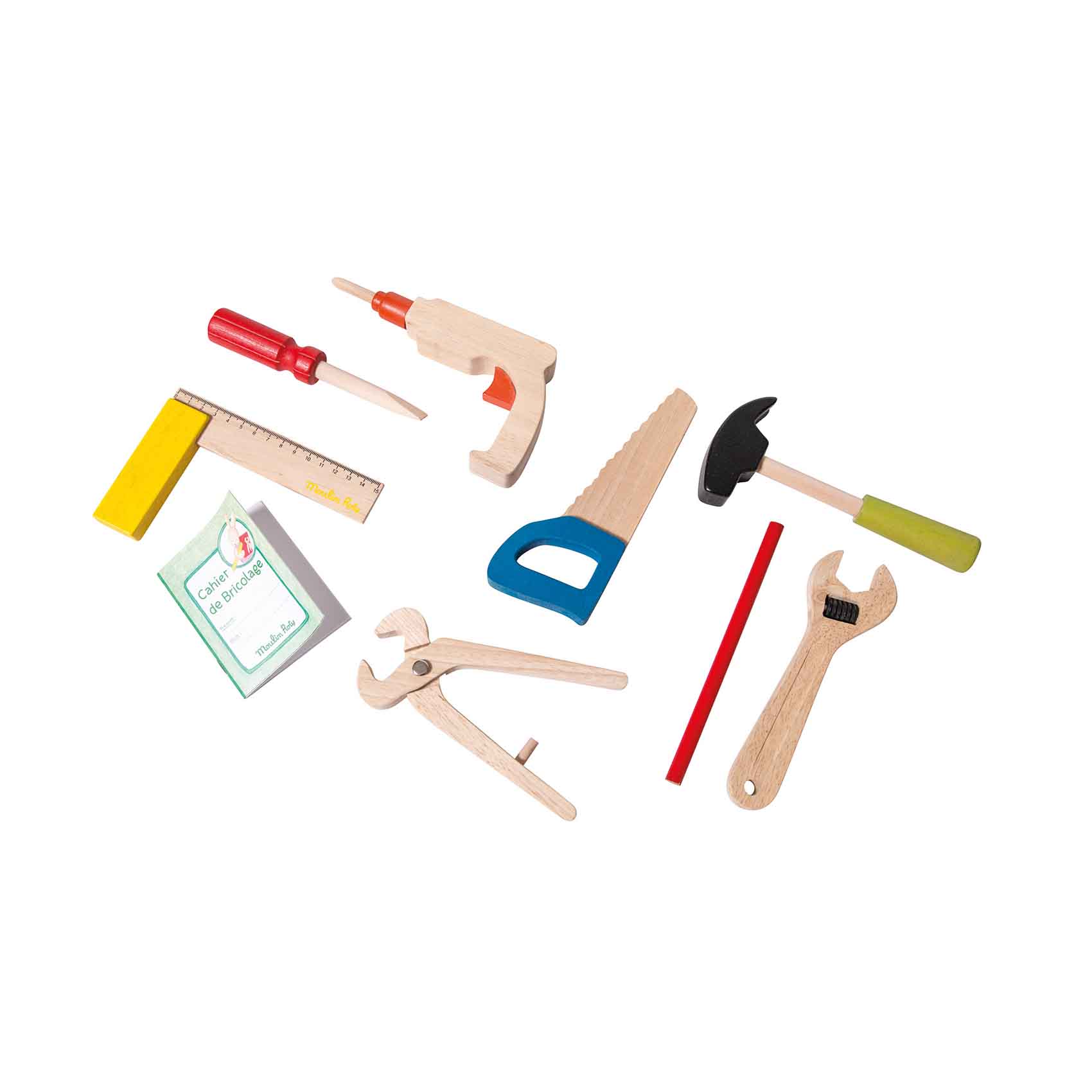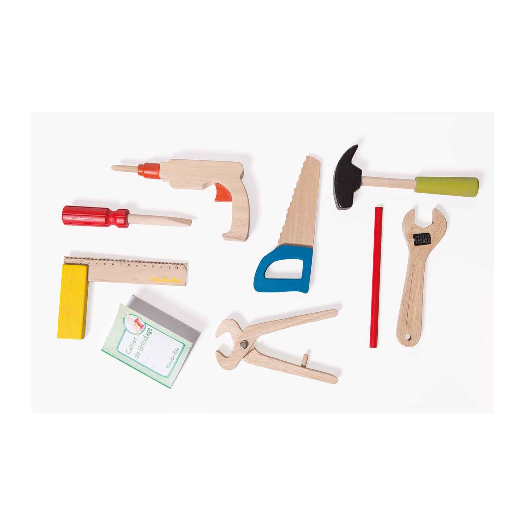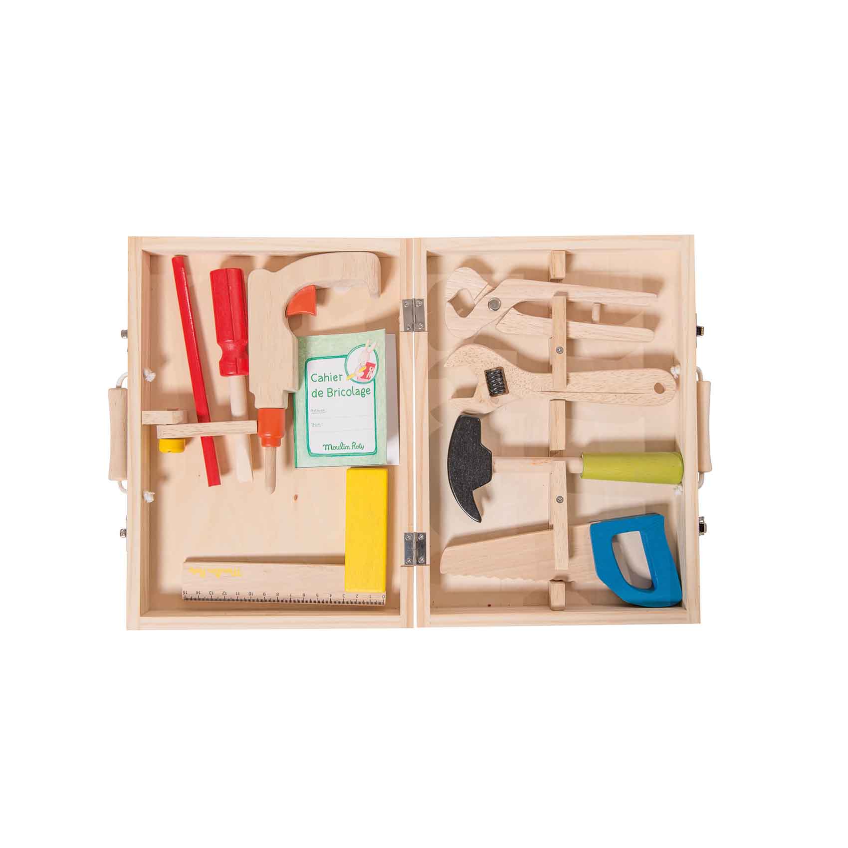 Valigetta in cartone richiudibile che contiene tutti gli attrezzi in legno di cui ha bisogno un vero falegname.